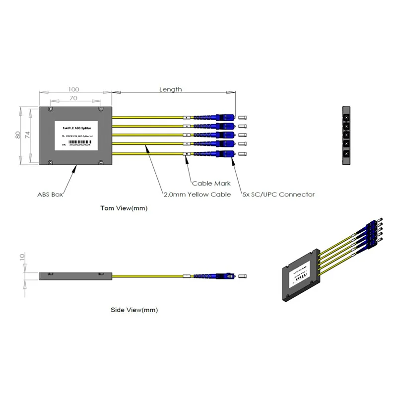 1x4 Planar Lightwave Circuit Cassette Splitter Package 100x80x10mm, φ2.0 Gul PVC kabellengde 2,0 +0,1/-0m, 5pcs SC/UPC-kontakt.