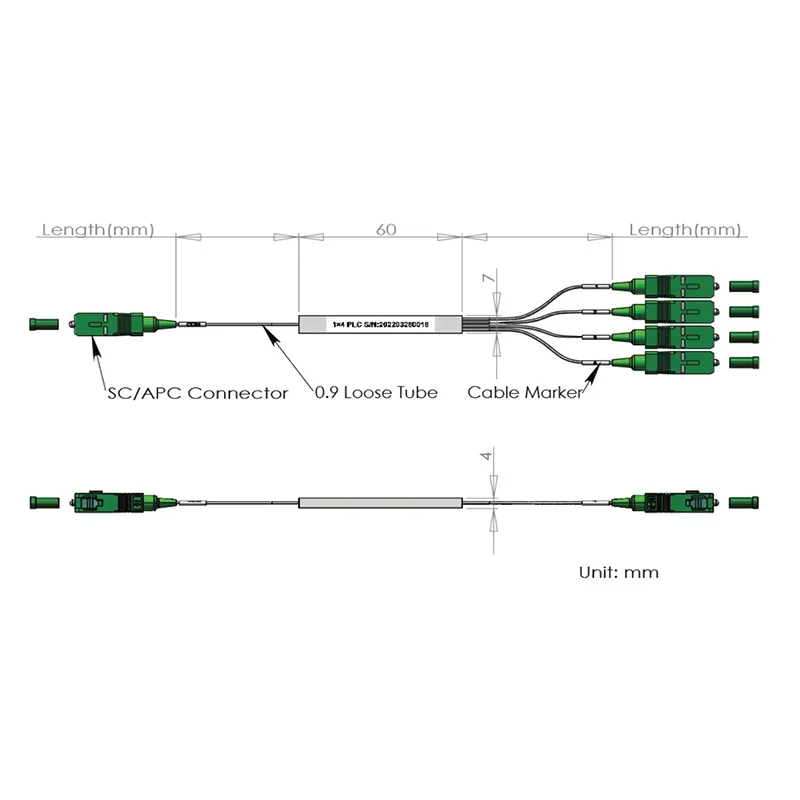 1x4/1 × 8 PLC Splitter Steel Tube-pakke 60x7x4mm, med 900μm løs rør 1.0+0.1/-0m, SC/APC-kontakt.